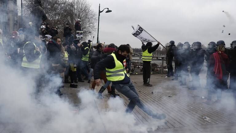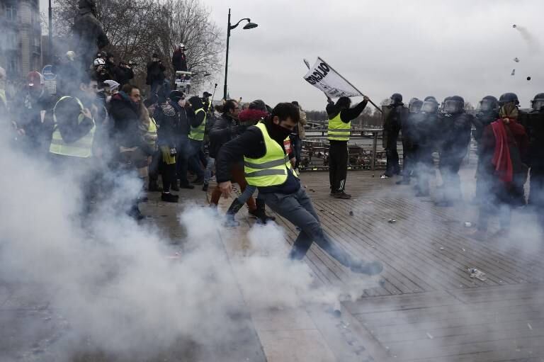 Varios miles de "chalecos amarillos" comenzaron muy temprano este sábado a deambular en calma desde la famosa avenida de los Campos Elíseos en París, hasta que en la tarde estallaron enfrentamientos con las fuerzas del orden que una vez más empañaron la jornada, la primera de 2019.