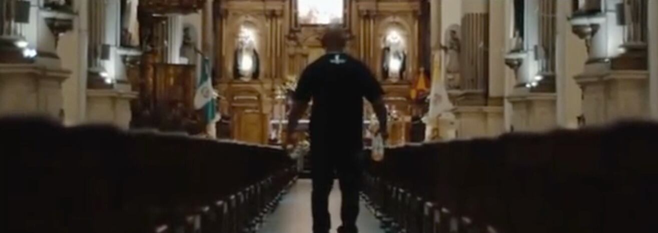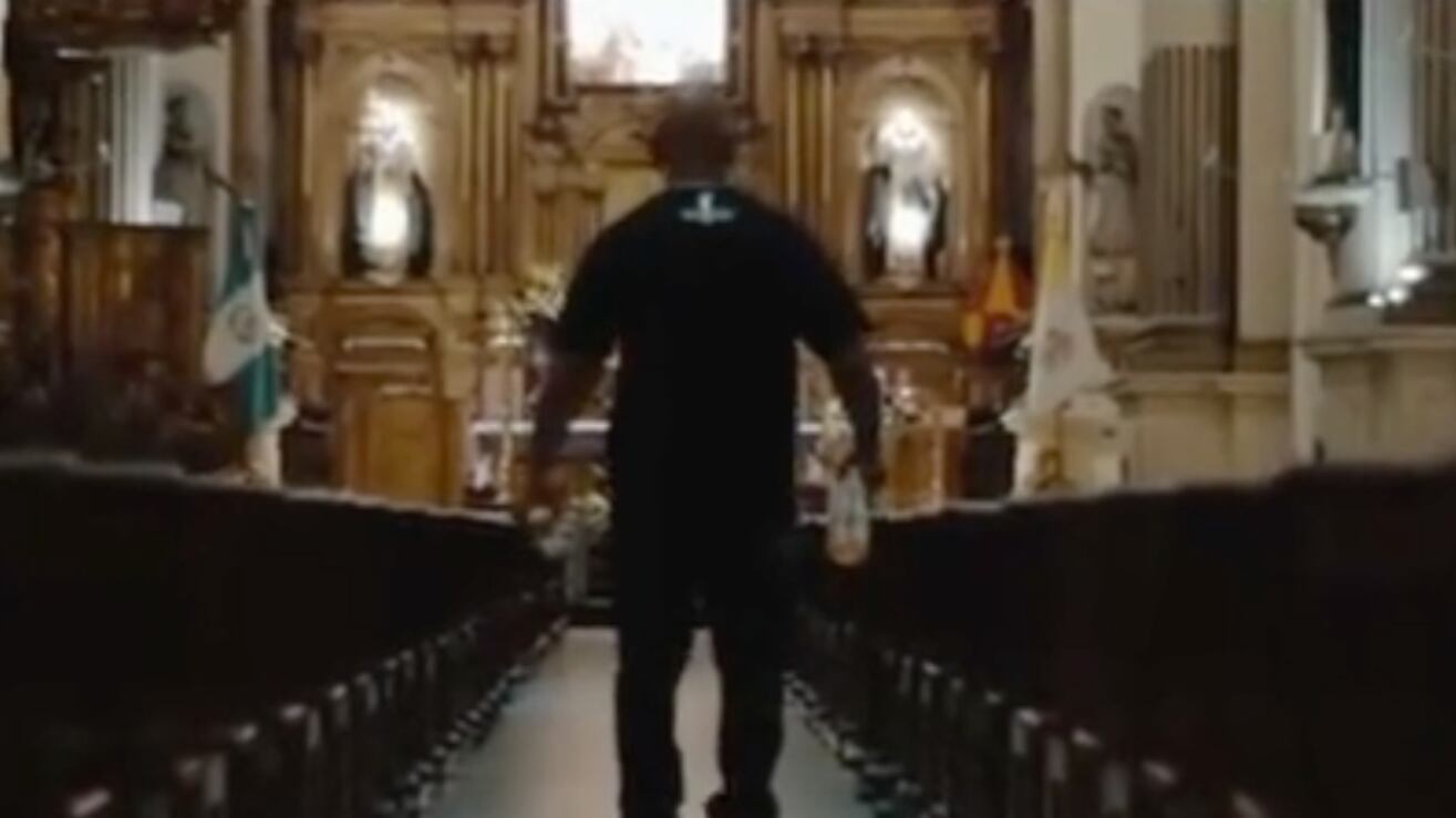 En las imágenes se observa un hombre vestido de negro que ingresa al templo, camina hacia el altar mayor, enciende una veladora y hace una señal de la cruz.
