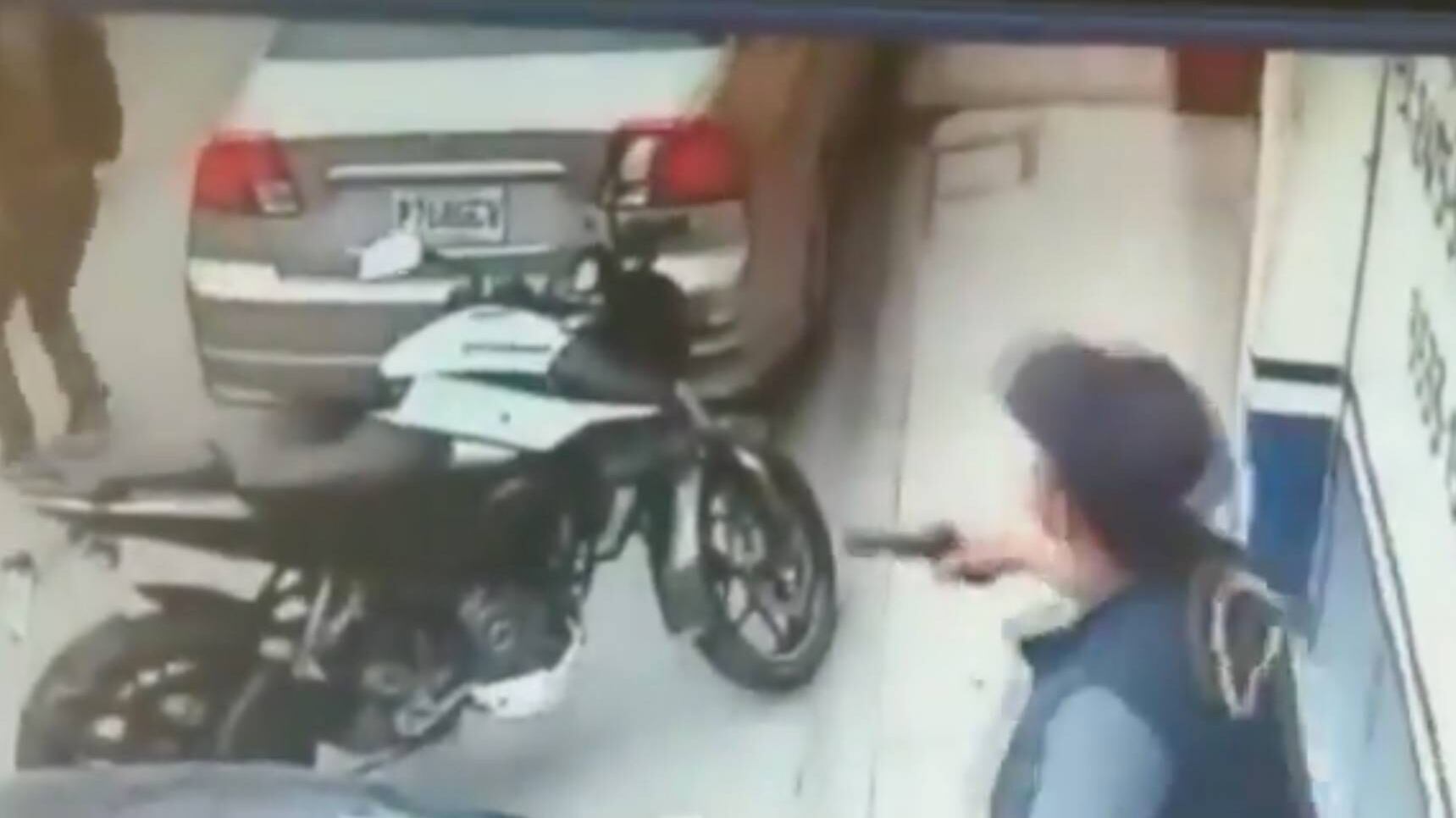 Uno de los elementos de la fuerza pública lleva su pistola en la mano, con la cual intenta someter al señalad, mientras que otro corre por otro lado.