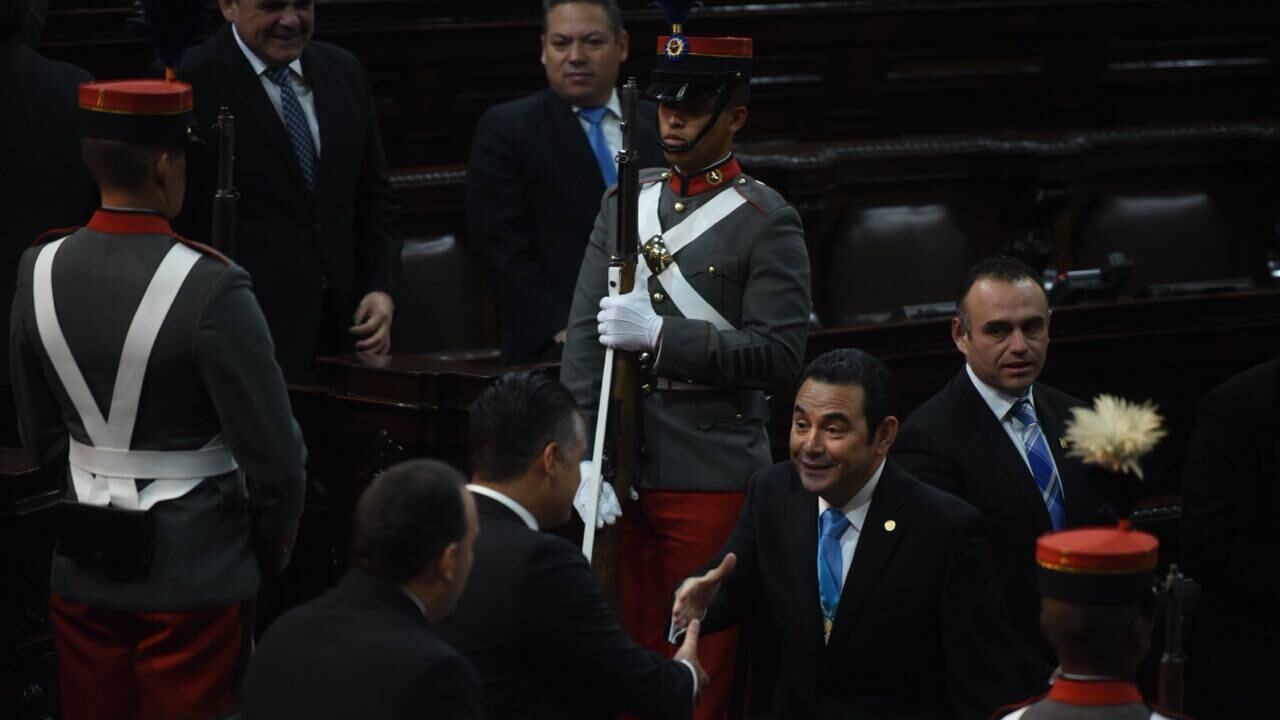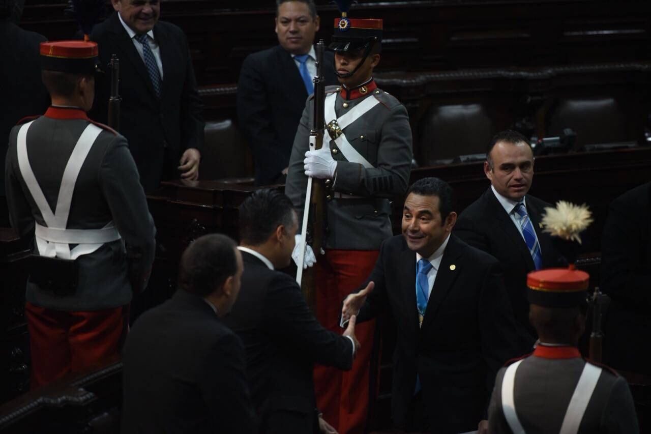 El presidente, Jimmy Morales, recibió aplausos de sus ministros, diputados e invitados durante su discurso en la sesión solemne de hoy en el Congreso.