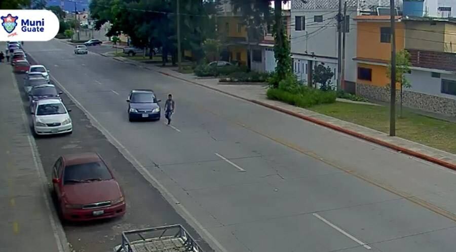 Un peatón se cruza la calle y ve al vehículo involucrado acercarse, sin embargo, no se detiene y por el contrario comienza a correr para llegar al otro lado.