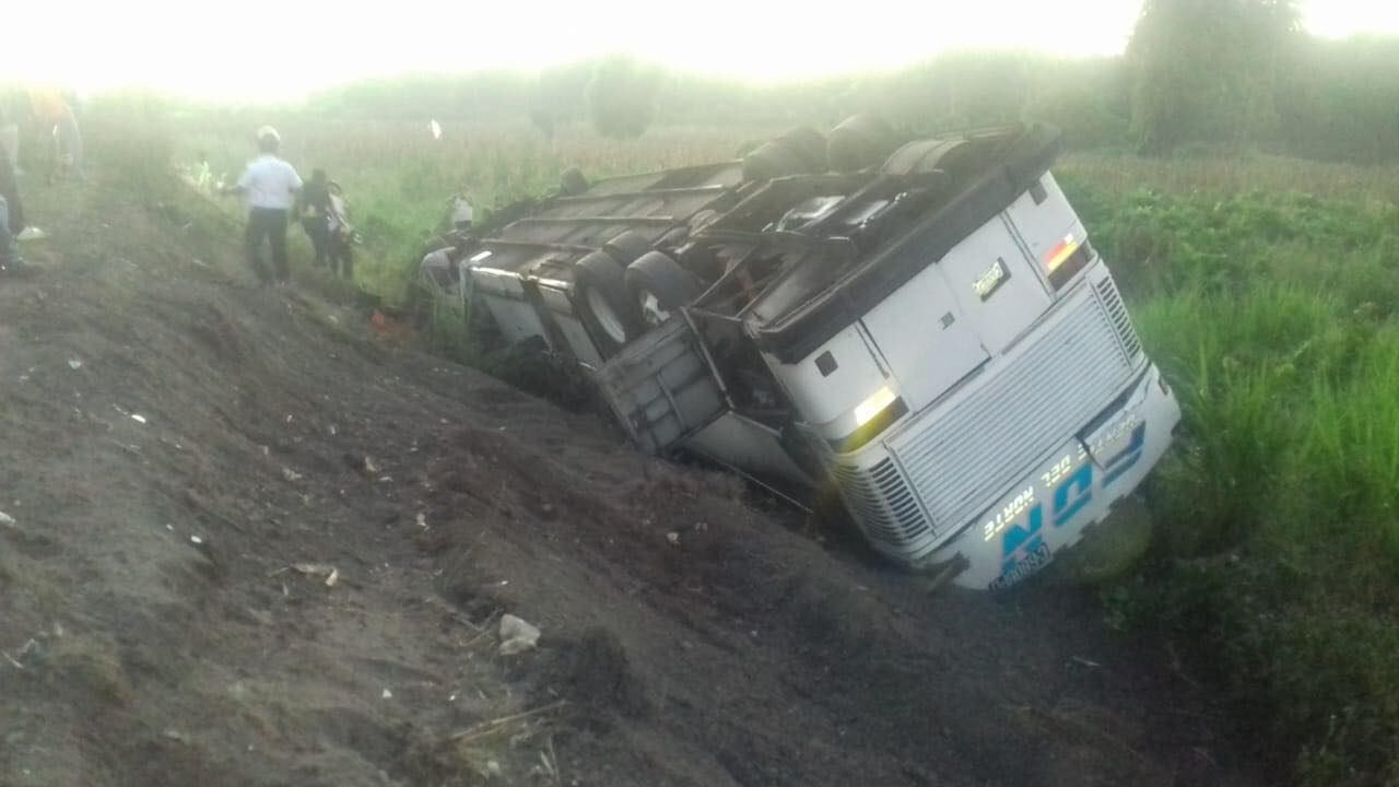 Eran aproximadamente las 6:00 horas de este martes cuando, por causas que aún no se han establecido, el conductor de la unidad de transporte tipo pulman perdió el control de esta, se salió de la ruta y volcó.
