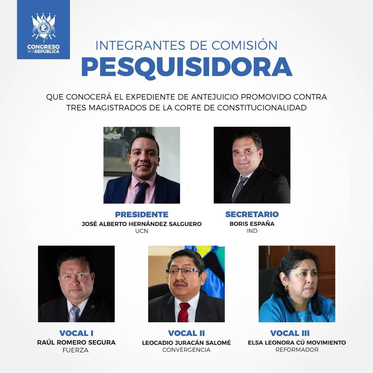 El diputado José Hernández, de UCN, fue electo presidente de la comisión pesquisidora. Boris España, independiente, como secretario; y Raúl Romero, de Fuerza; Leocadio Juracán, de Convergencia; y Elsa Cú, del Movimiento Reformador (MR), como vocales.