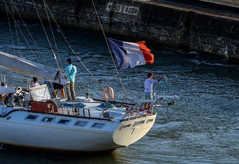 Vestidos con camisetas blancas de rayas azules horizontales y pantalones cortos, los cinco franceses saludaron a viajeros de otras embarcaciones, mientras decenas de personas los observaban desde un mirador.
