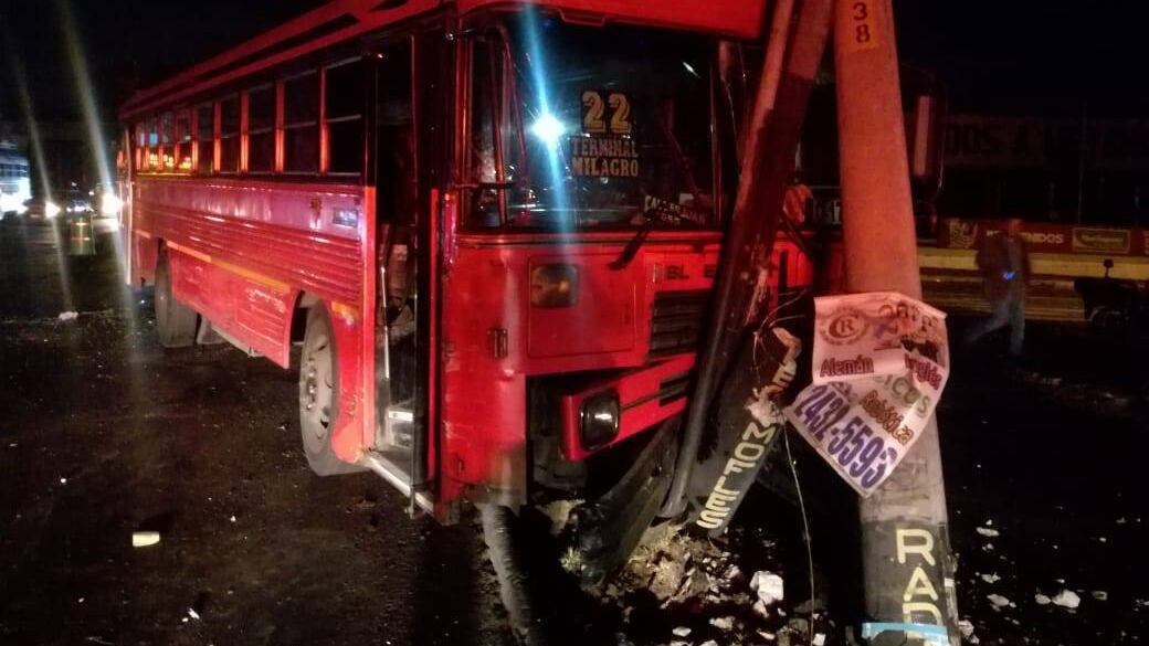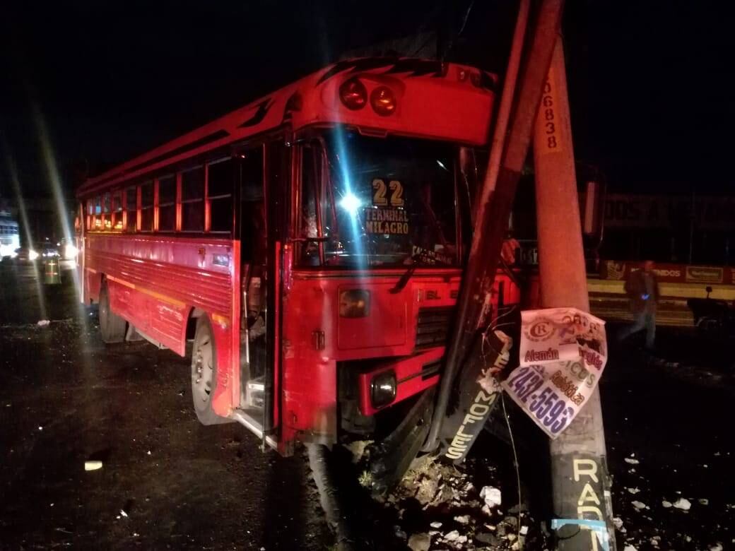 En tanto, la PMT de Mixco dio a conocer que un autobús se empotró en un poste de concreto en la 10ª avenida de la calzada San Juan, con dirección al occidente. Preliminarmente se indicó que el hecho no dejó personas heridas, solo daños materiales.