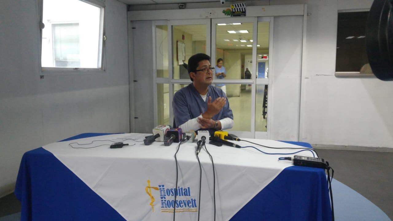El director del Hospital Roosevelt, doctor Marco Antonio Barrientos, brindó una conferencia de prensa para dar detalles sobre los heridos por la explosión en un bus urbano ayer, en la zona 7 capitalina.