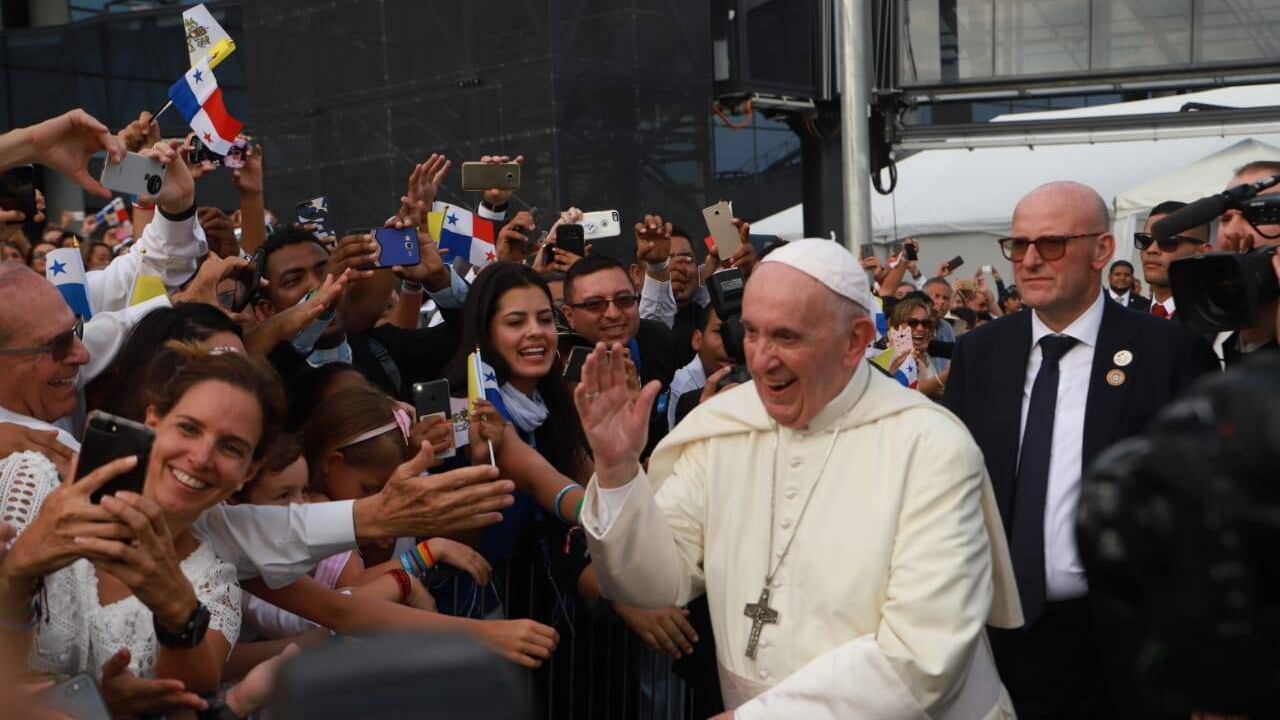 El Santo Padre se desplazó en vehículo cerrado desde el aeropuerto durante media hora para luego cambiar al papamóvil en un punto y recorrer siete kilómetros hasta la Nunciatura en medio de un río de almas que levantaban banderas panameñas y de todo el mundo.