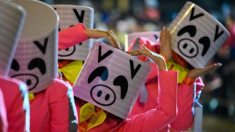 Lana Wong, una reconocida actriz de la región autónoma, se vistió con un disfraz de cerdo para el evento.