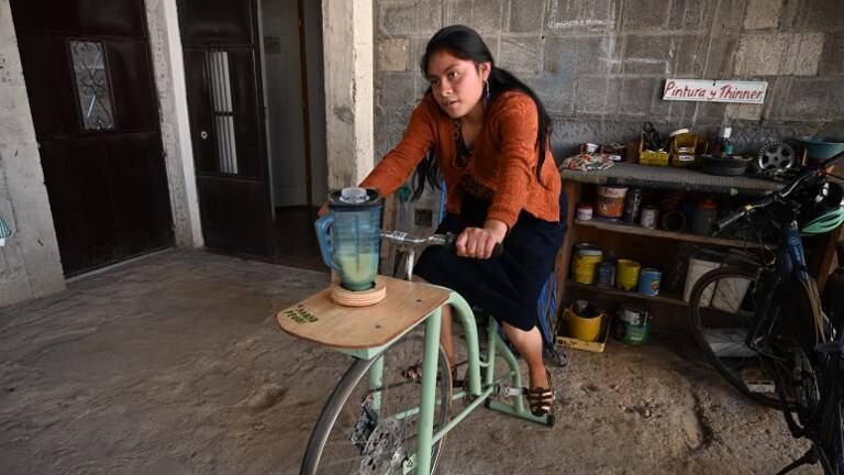 Danha Alvarado pedalea y hace girar una rueda conectada a un molino de maíz, un invento creado por indígenas guatemaltecos pioneros en la construcción de máquinas usando bicicletas recicladas para proteger el medioambiente y apoyar a familias pobres.