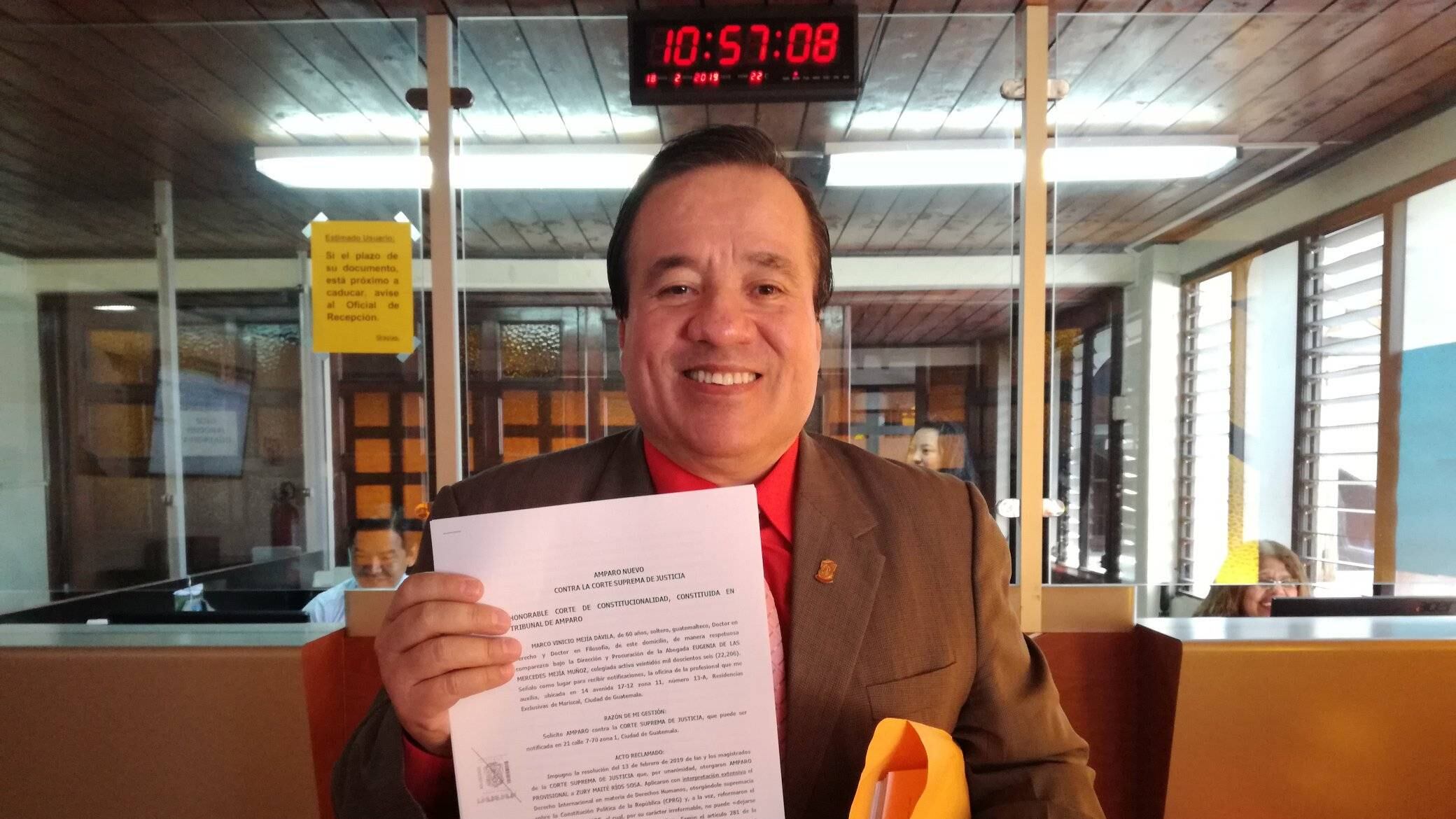 Marco Vinicio Mejía impugnó en la Corte de Constitucionalidad (CC) la resolución de la Corte Suprema de Justicia (CSJ) que, por unanimidad, otorgó un amparo provisional a Zury Ríos para que fuera inscrita como candidata a la presidencia por el partido político Valor.
