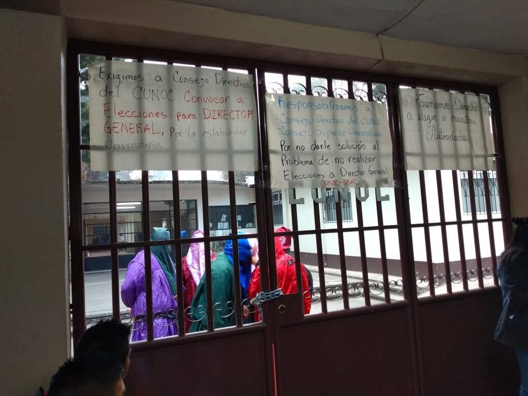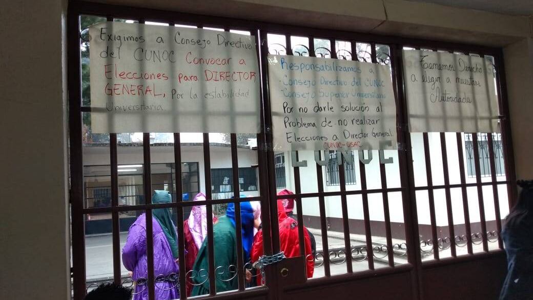 Además, diferentes pancartas fueron colocadas en los portones y ventanas. “Responsabilizamos al Consejo Directivo del Cunoc y Consejo Superior Universitario por no darle solución al problema de no realizar elecciones a Director General”, se lee en algunas.