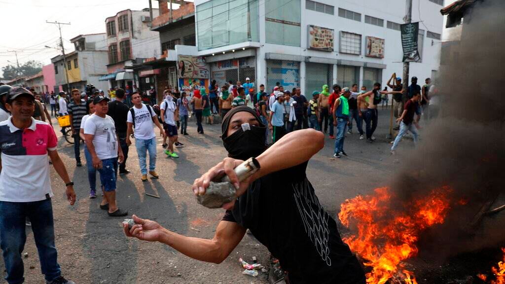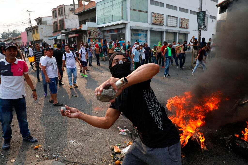 Entre aplausos y al grito de “¡Sí se puede!”, cientos de manifestantes vestidos con camisetas blancas, y portando banderas venezolanas y pequeñas pancartas, intentaron avanzar hacia el puente internacional Francisco de Paula Santander, que comunica la ciudad venezolana de Ureña con la colombiana de Cúcuta, pero fueron repelidos por cientos de guardias nacionales que sin mediar palabras comenzaron a lanzarles varias andanadas de gases lacrimógenos para dispersarlos.