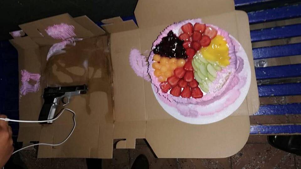 Ella fue sorprendida flagrante cuando en el interior de la caja donde llevaba un pastel de frutas, también escondía un arma de fuego.