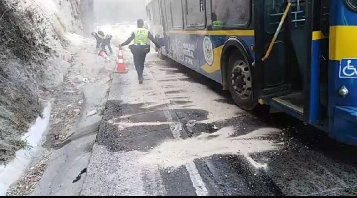 Un derrame de combustible en la subida de Villalobos complica este miércoles la circulación por el sector. Agentes de la Policía Municipal de Tránsito (PMT) de Villa Nueva coordinan la limpieza.
