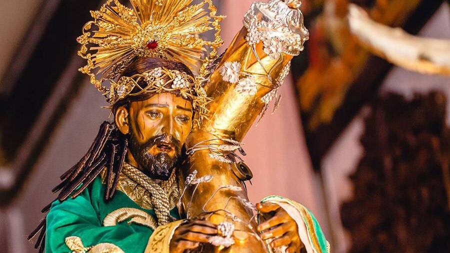 Y al final del mueble procesional se observa el anagrama JHS: Jesús – Hombre – Salvador.