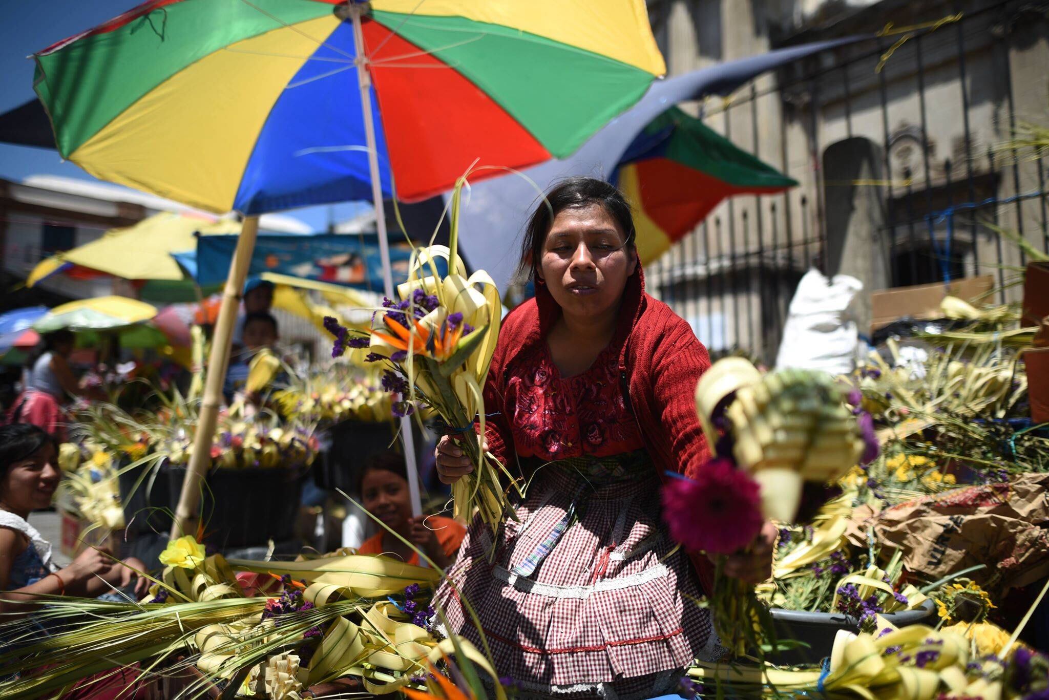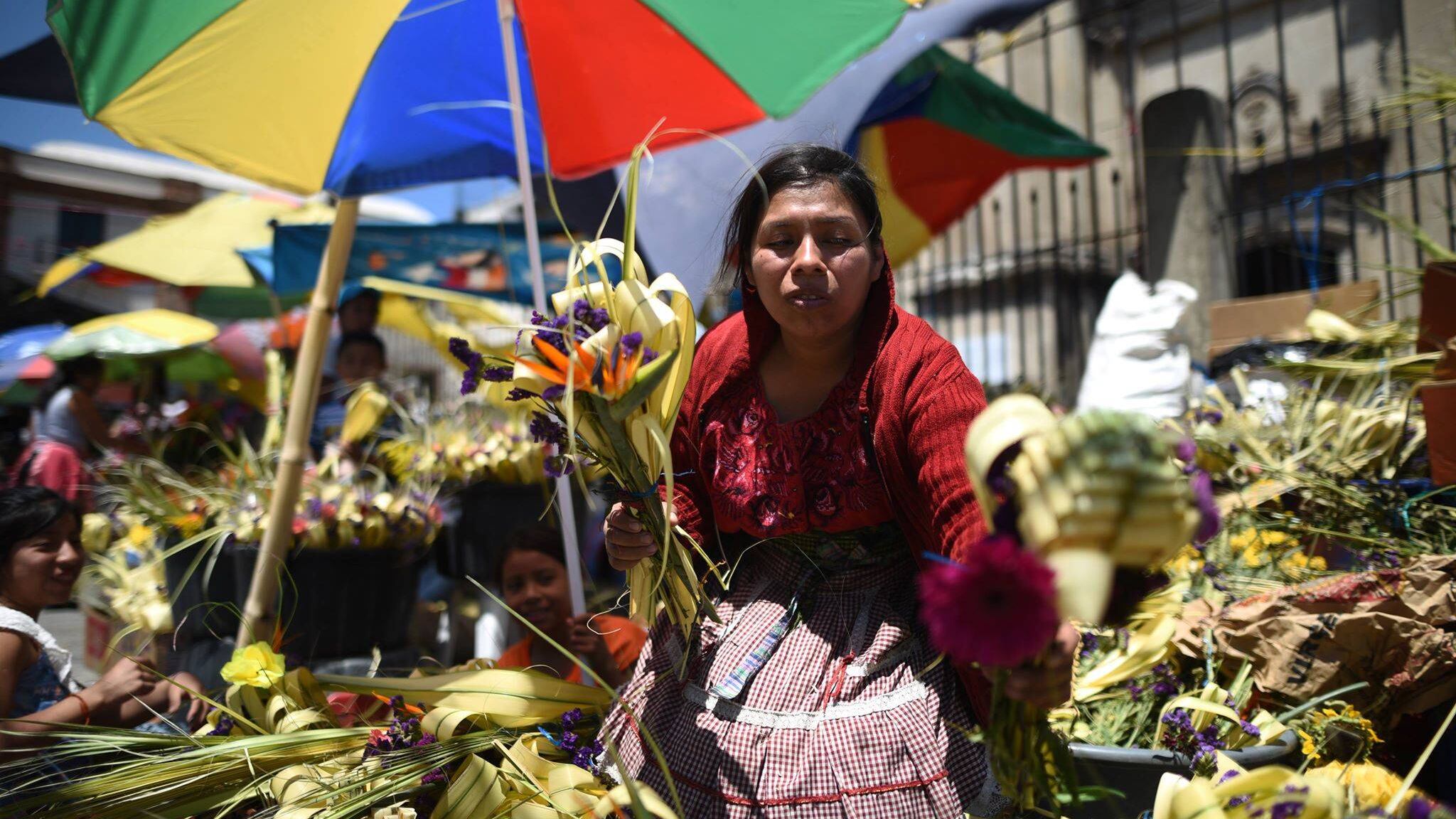 Mientras decenas de personas caminan a paso largo en las calles del Centro Histórico para poder alcanzar los cortejos procesionales que recorren las calles y avenidas de la zona 1, Aida Magdalena Pirir López, se instala en el templo La Merced para ofrecer los típicos ramos del Domingo de Ramos.