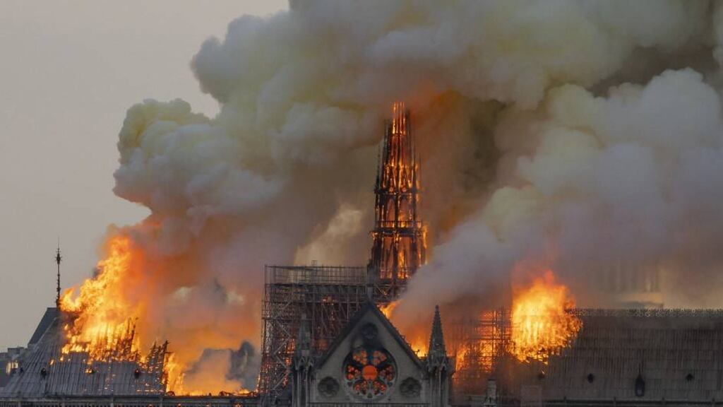 En poco más de una hora el fuego echó abajo la aguja de 93 metros de alto, uno de los símbolos de París, provocando un grito de horror entre la muchedumbre agolpada en los puentes del Sena y en las calles adyacentes.