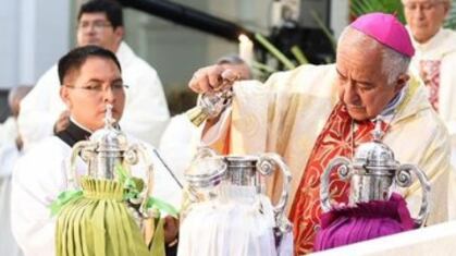 El obispo bendice los óleos o aceites (para los enfermos y los que se van a bautizar) y consagra el Santo Crisma.