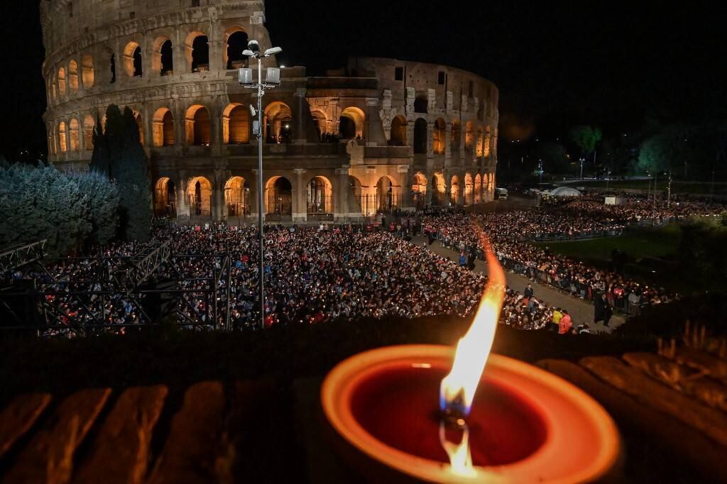 Su texto crudo y directo fue leído mientras se cargaba una larga cruz gris en el fondo del Coliseo de Roma, luego en el exterior de este lugar emblemático de las persecuciones contra los cristianos durante el imperio romano.