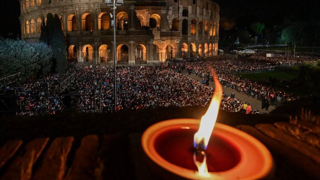Alrededor del anfiteatro había unos 20.000 fieles que siguieron en silencio la ceremonia nocturna.