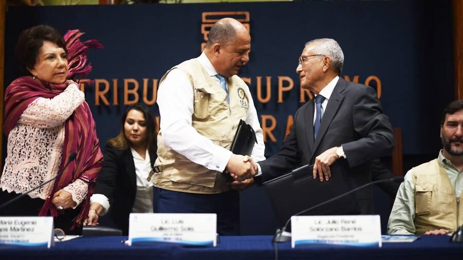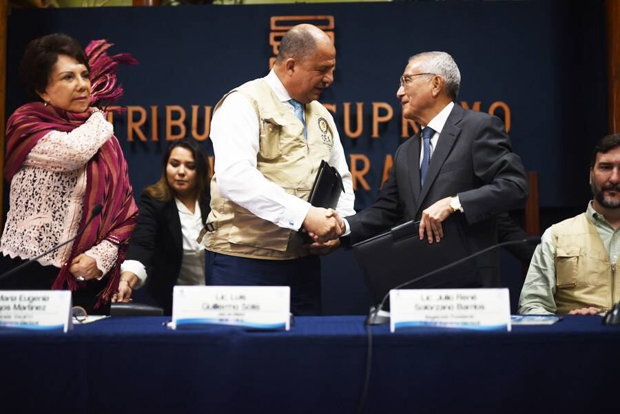 Solís y el TSE firmaron ayer el convenio de cooperación en la sede del tribunal.
