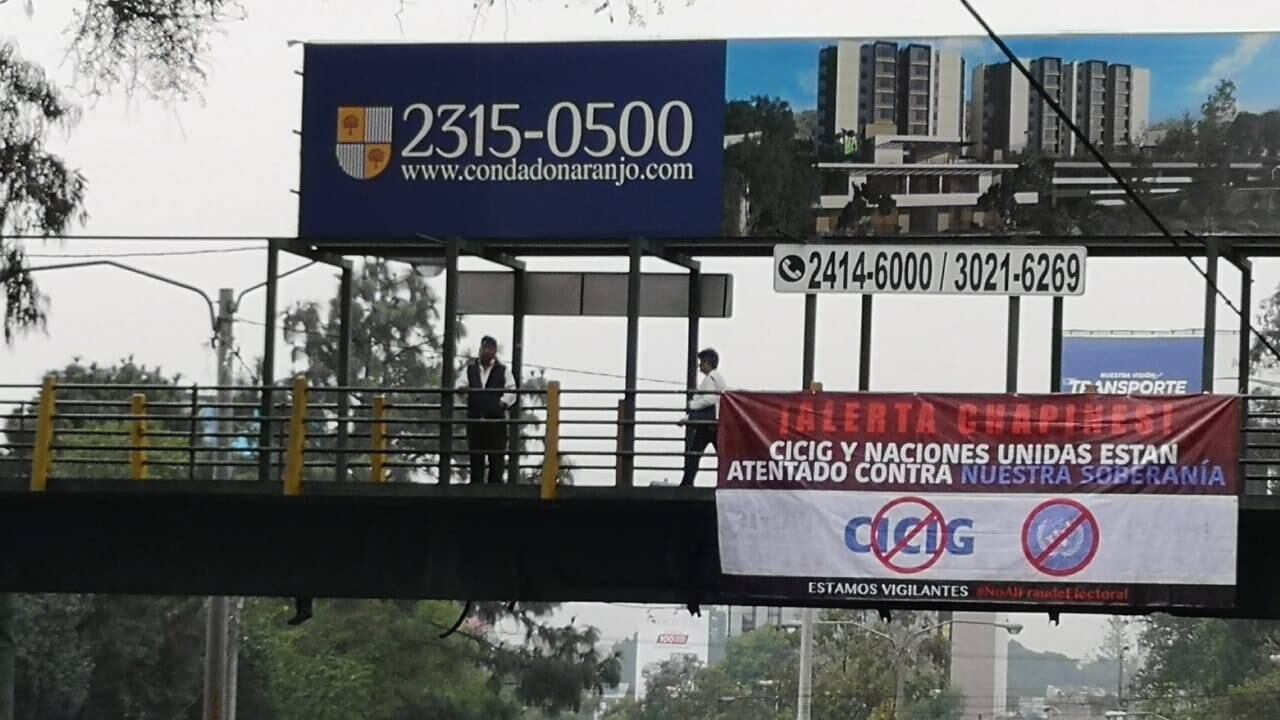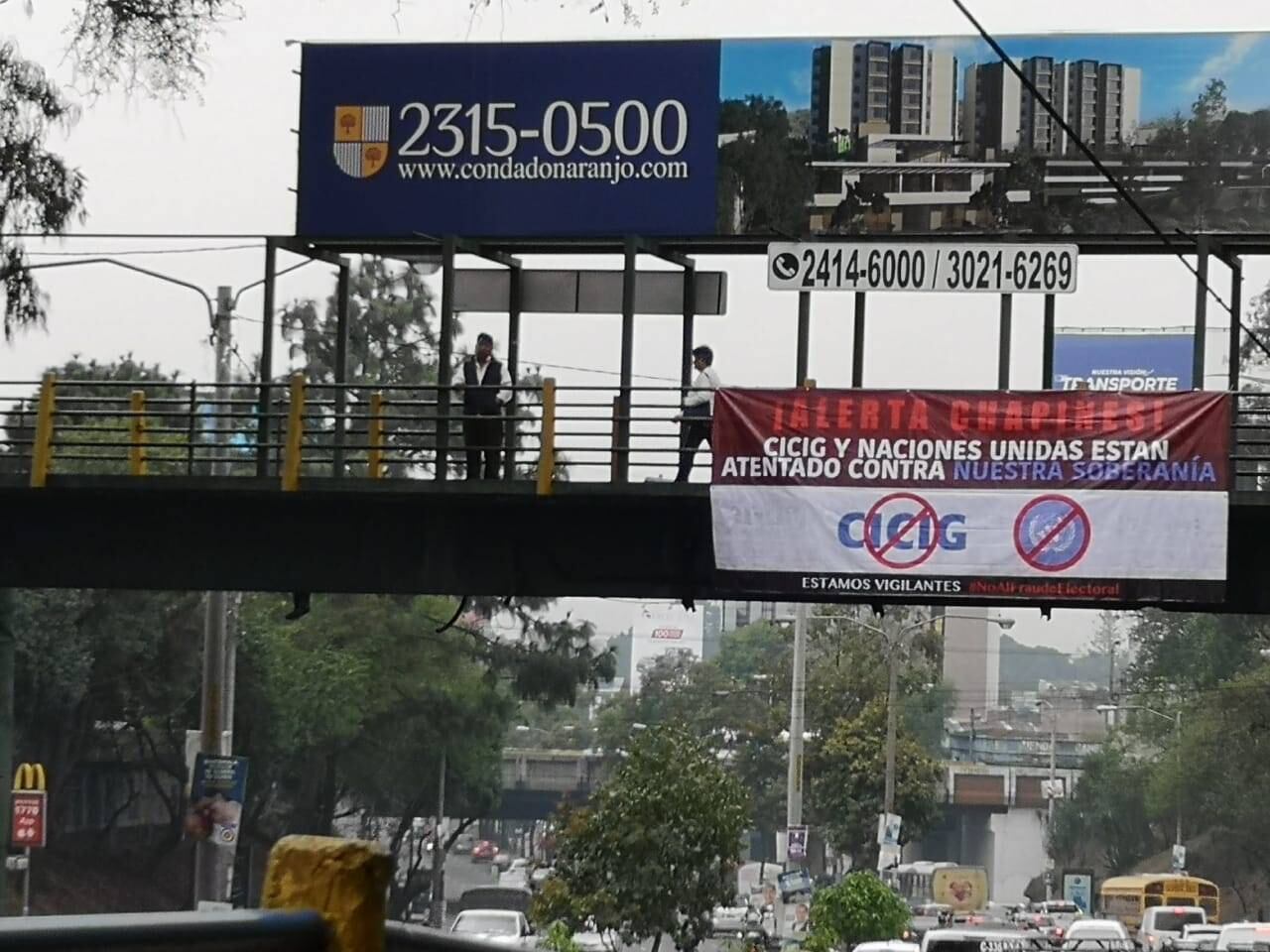 En los letreros se señala a la Comisión Internacional Contra la Impunidad en Guatemala (CICIG) y a la Organización de Naciones de pretender interferir en los comicios de junio próximo.