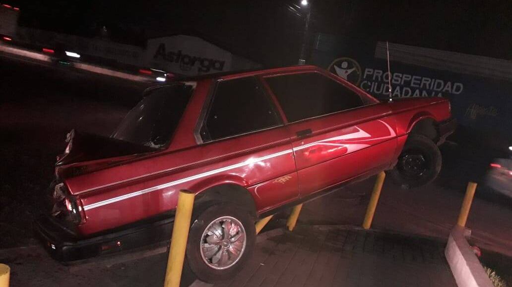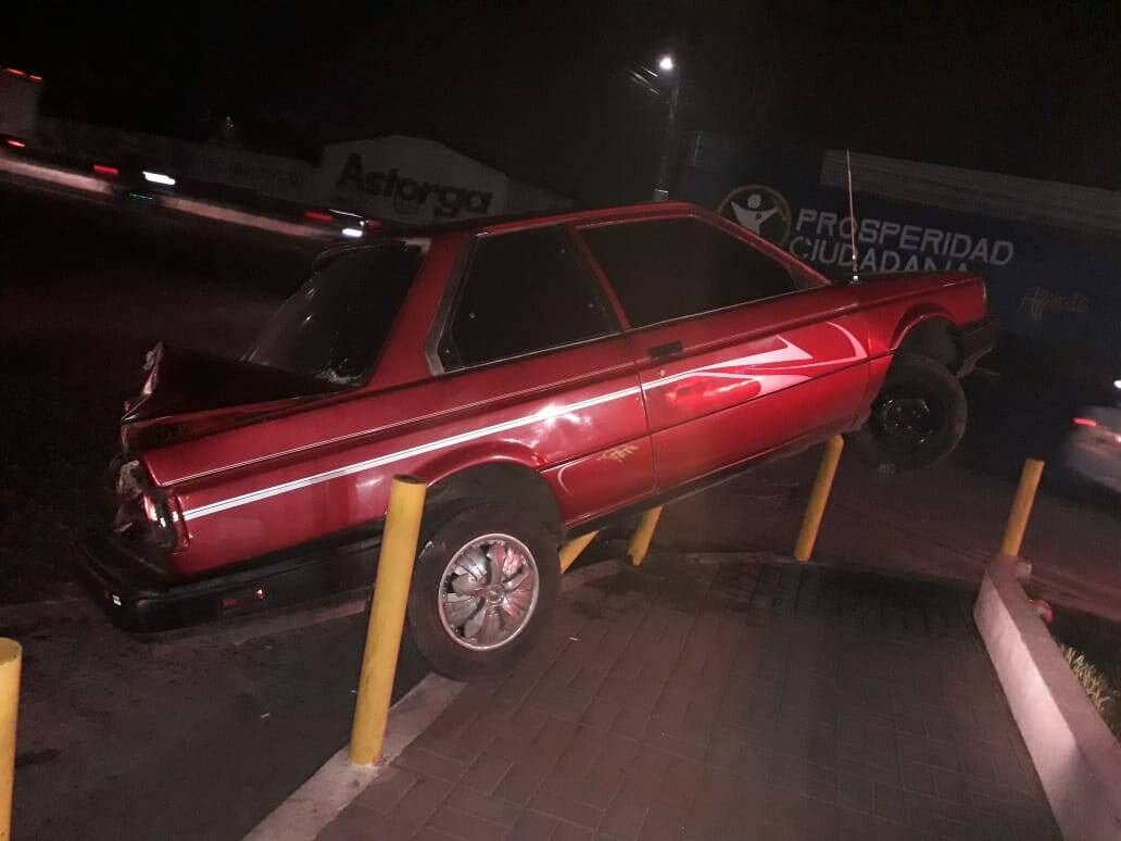 Con las llantas delanteras en el aire quedó un vehículo luego de que, por causas aún no establecidas, el conductor perdiera el control de este y se empotrara en varios postes.