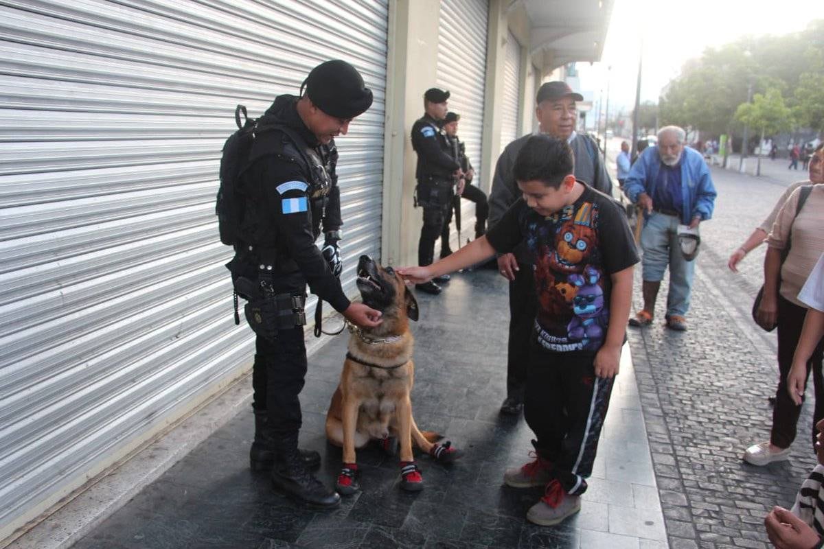 Los perros policías Rony y Pluto fueron el foco de atención de varios peatones en el Paseo de La Sexta, zona 1.
