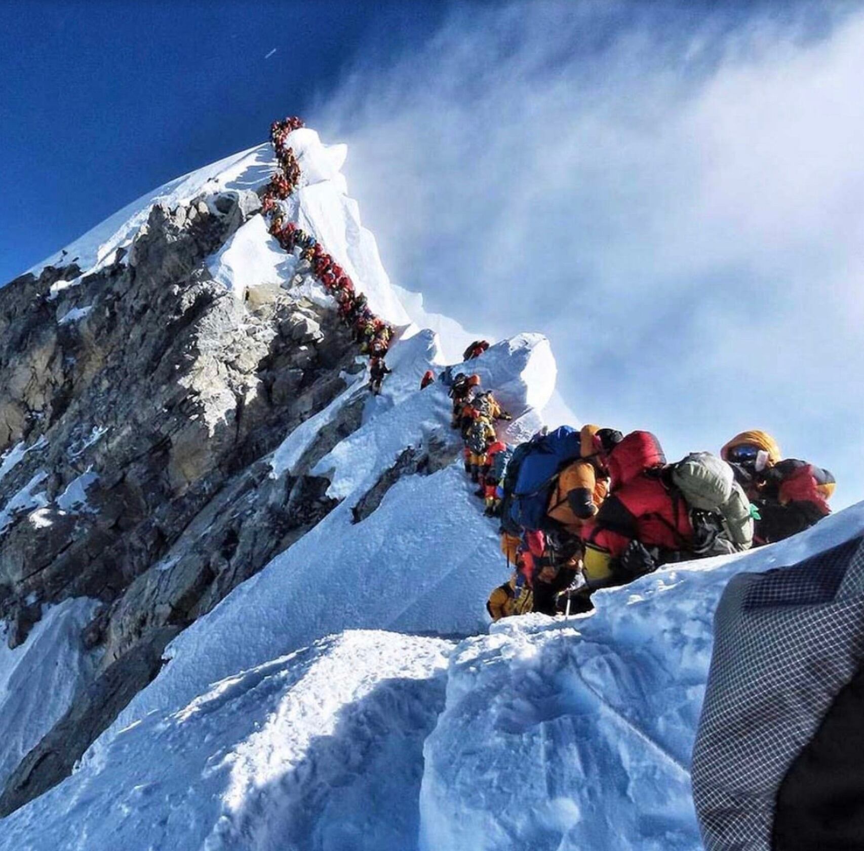 Según los informes, se produjeron varias muertes debido a un cuello de botella formado en la montaña con muchas colas en la "zona de la muerte" que intentaban alcanzar la cima.
