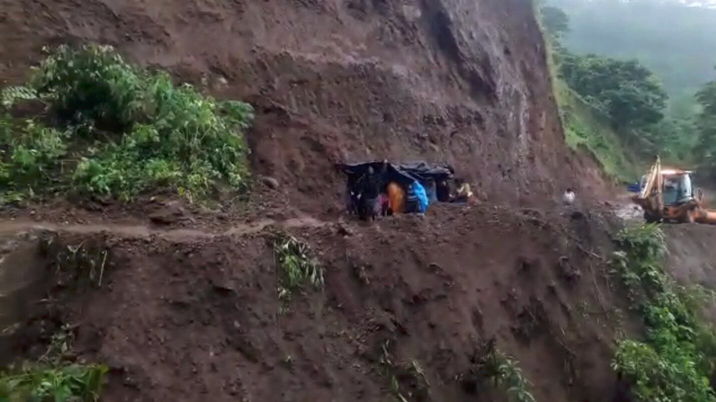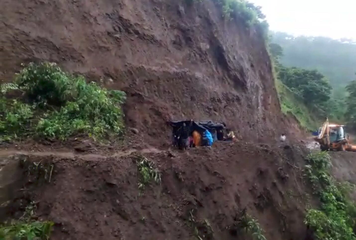 Bajo la lluvia y cubiertos con nylon, las personas cruzan a pie el área del deslizamiento mientras maquinaria municipal trabaja para remover los escombros.