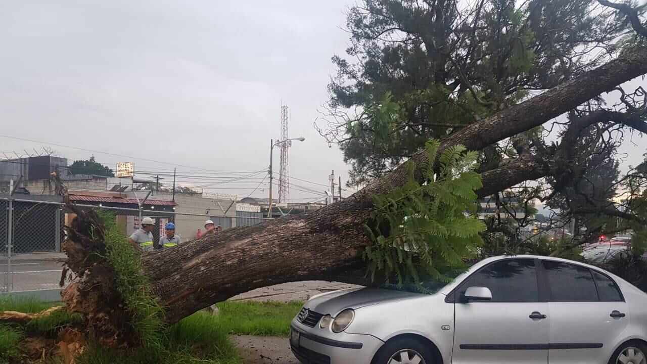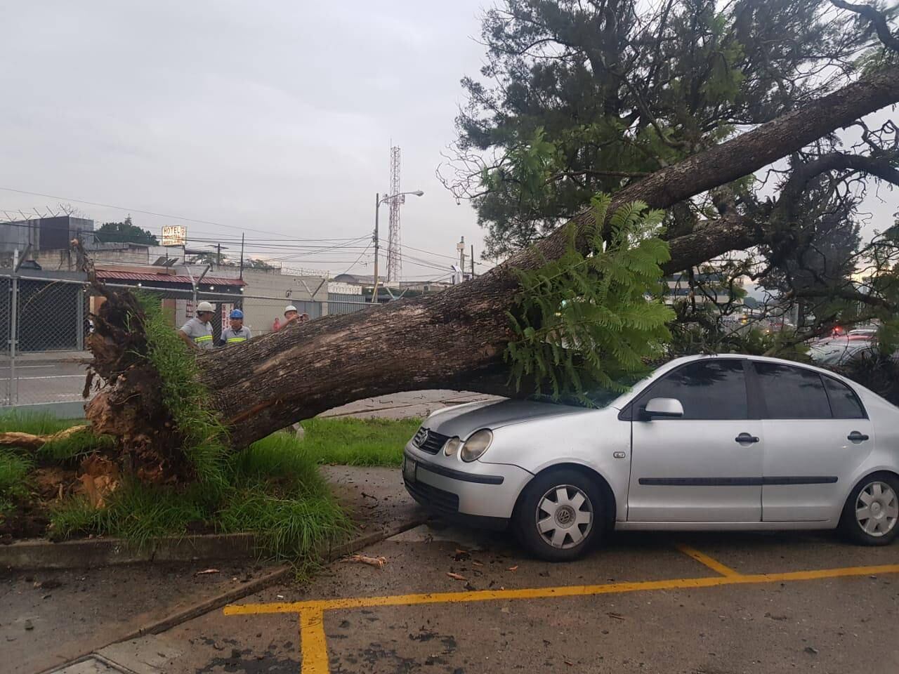 Un árbol cayó sobre un vehículo de cuatro puertas que se encontraba en el estacionamiento del Parque de la Industria, zona 9.