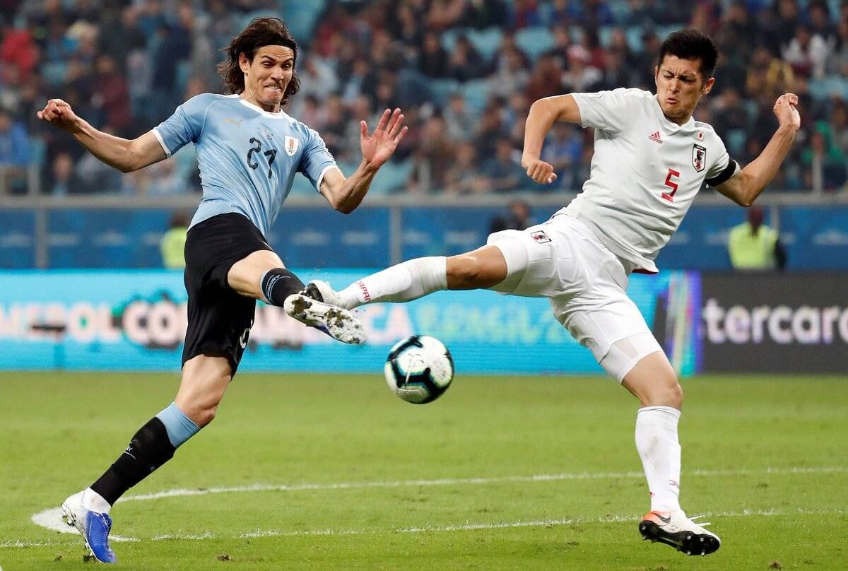 Cavani ya había levantado la pierna derecha para pegarle al balón, cuando el japonés respondió de la misma manera.