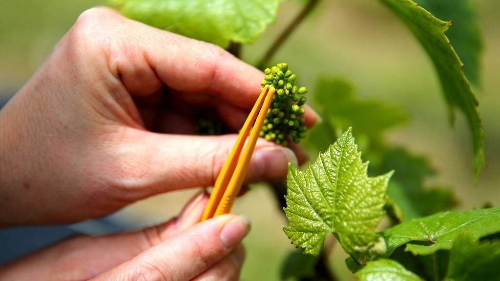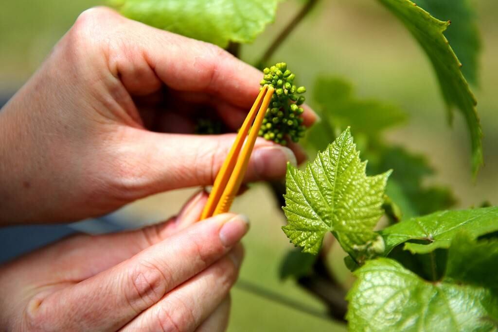 Todo comienza capando con una pinza las flores de una cepa emblemática de champagne, por ejemplo el chardonnay. Luego se fecundan con el polen de una variedad resistente y el futuro racimo se protege con una bolsa de papel a la espera de la cosecha.