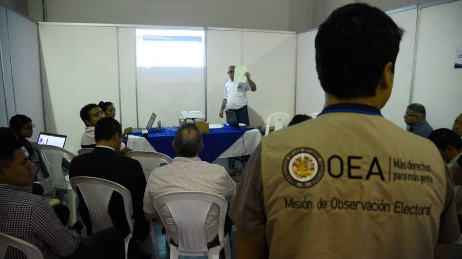 En cada una de las 26 mesas hay personal del Tribunal y se cuenta con una computadora y un retroproyector, en el cual se muestra la papeleta escaneada y el sistema informático, para que esta sea cotejada con la papeleta física.