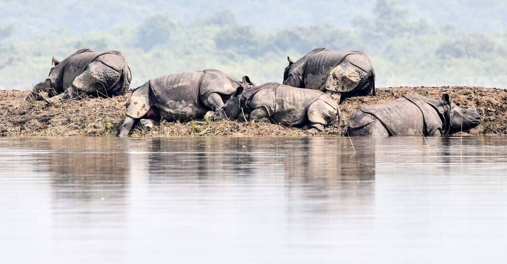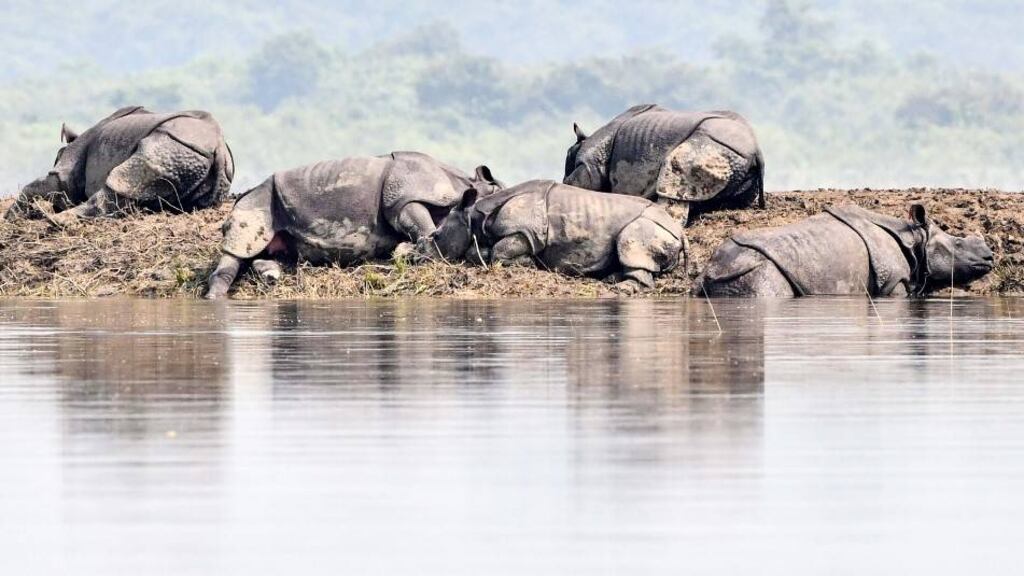 En el estado de Asam, en India, pudieron verse algunas escenas insólitas y poco frecuentes, como búfalos salvajes corriendo entre las aguas, rinocerontes agotados que descansaban en pequeños retazos de terreno sin anegar o elefantes cruzando una carretera, en tanto los guardabosques del parque corrían para intentar alcanzarlos.