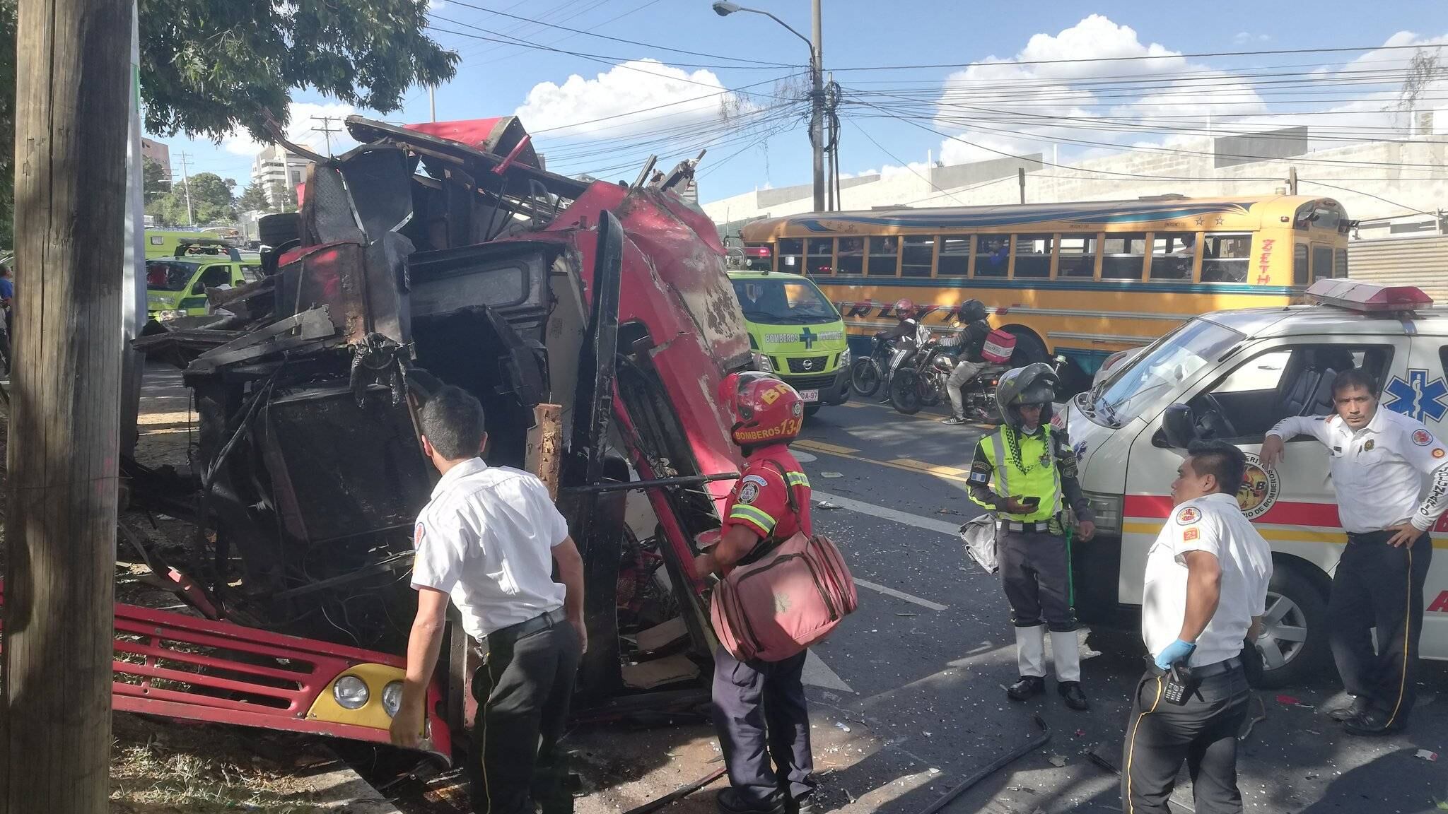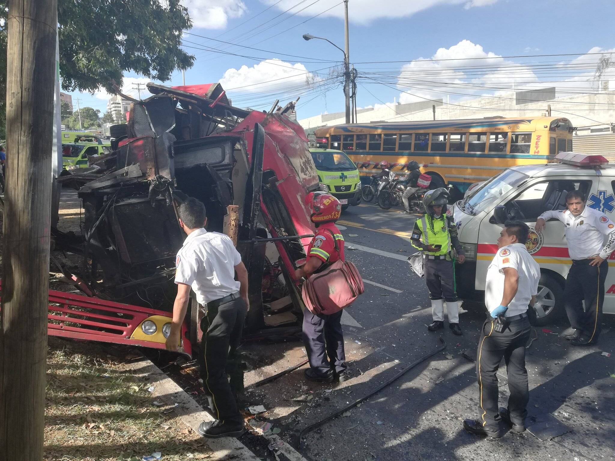 La unidad de transporte urbano de la ruta 65 volcó en la avenida Hincapié y 27 calle "B" de la zona 13. Varios pasajeros resultaron gravemente heridos.