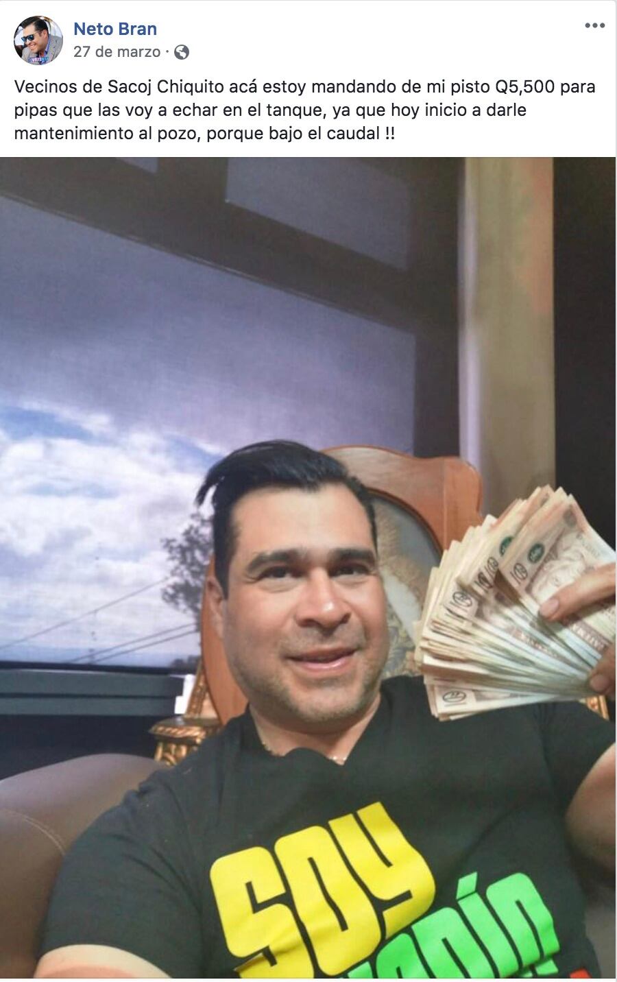 El alcalde de Mixco, Neto Bran, publicó un mensaje en el que aseguró que envió Q3 mil 25 de su salario para el pago de pipas de agua en algunas colonias.