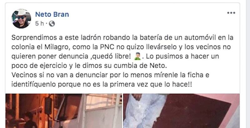 "Sorprendimos a este ladrón robando la batería de un automóvil en la colonia el Milagro, como la PNC no quizo llevárselo y los vecinos no quieren poner denuncia, quedó libre! Lo pusimos a hacer un poco de ejercicio y le dimos su cumbia de Neto. Vecinos si no van a denunciar por lo menos mírenle la ficha e identifíquenlo porque no es la primera vez que lo hace!!".