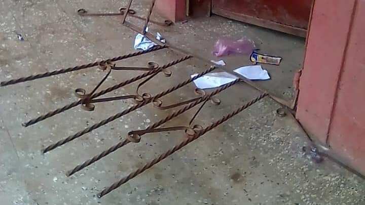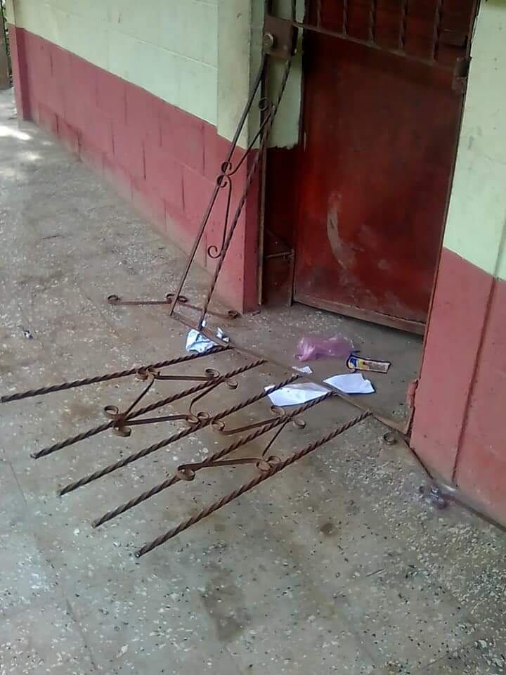 En las fotografías compartidas por los docentes se puede observar como fue violentada la reja que protegía la puerta de acceso al aula.