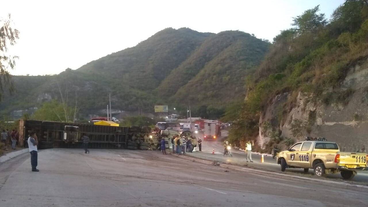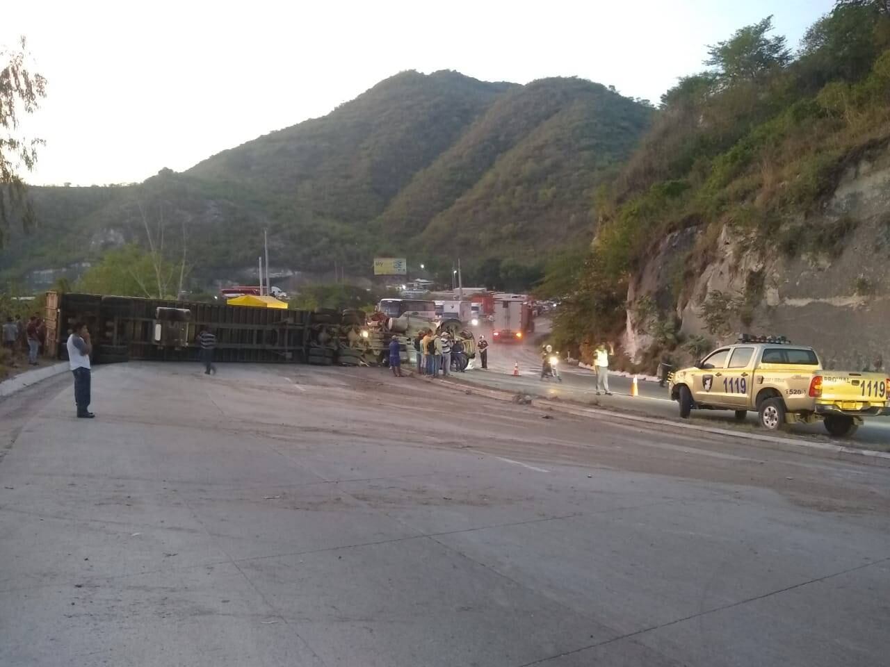 En horas de la madrugada un tráiler volcó en el kilómetro 46 de la ruta que conduce al Atlántico, en jurisdicción de Sanarate, El Progreso.