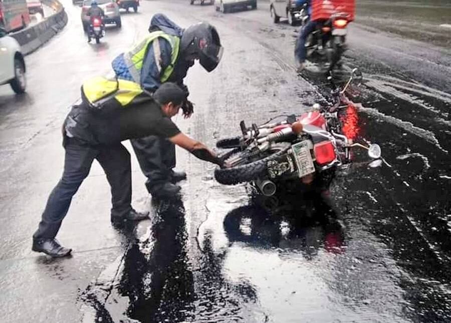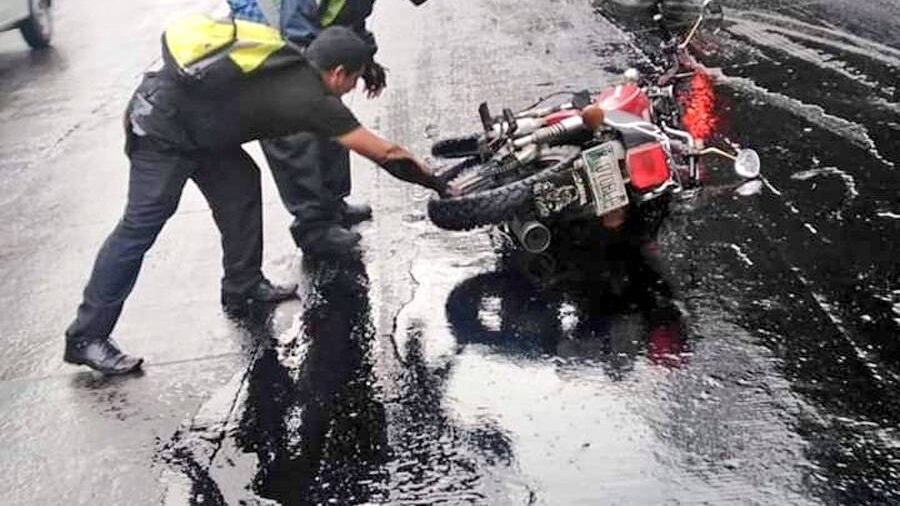 Tal fue el caso de varios motociclistas que no pudieron eludir el combustible y derraparon.