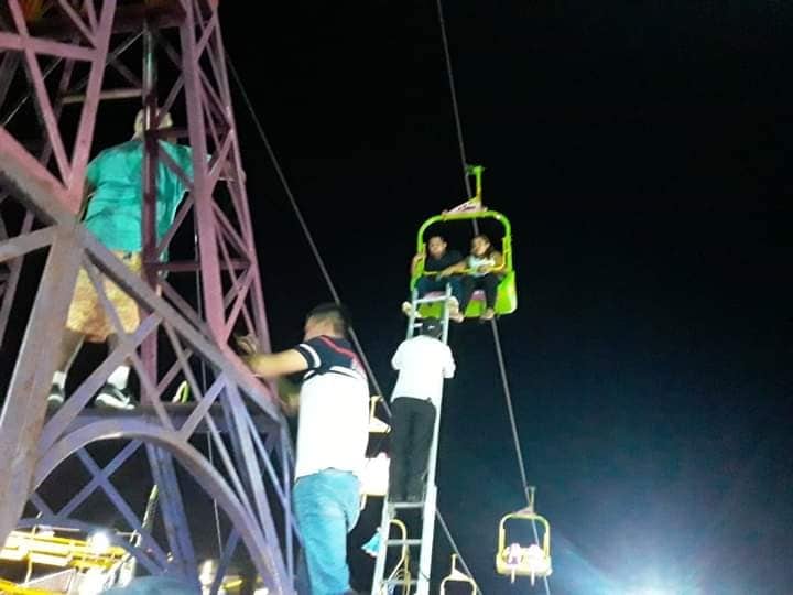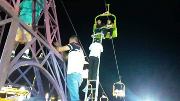 Una pareja quedó colgada de uno de los sillones de la rueda pero fuero rescatados por comunitarios.