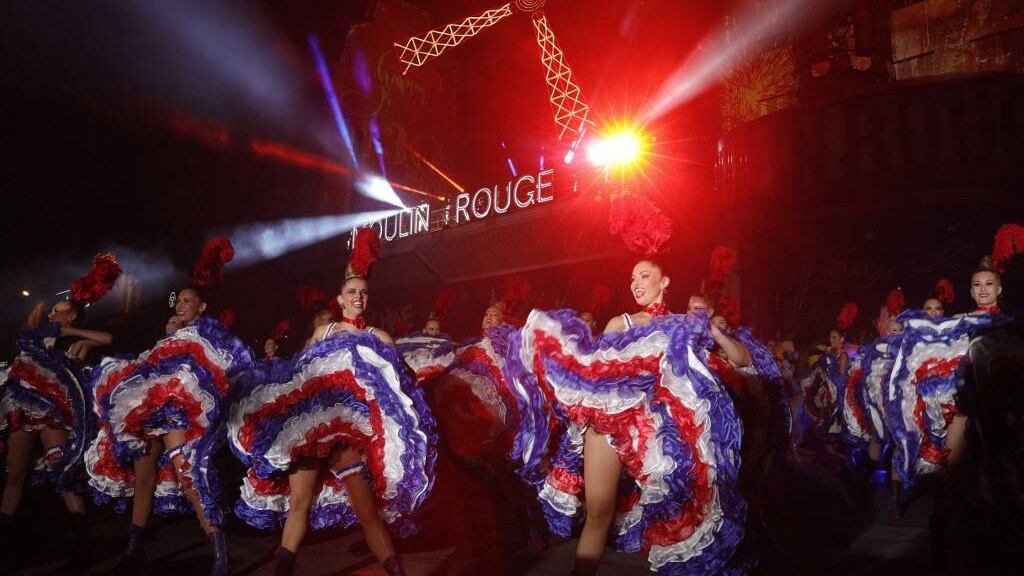 Miles de personas se congregaron el domingo por la noche en el bulevar frente al Moulin Rouge de París para asistir a un espectáculo de can-can y fuegos artificiales celebrando los 130 años del célebre cabaret de Montmartre.