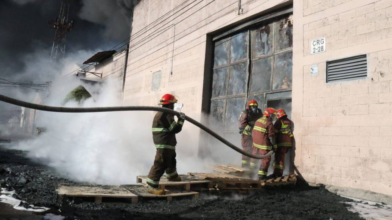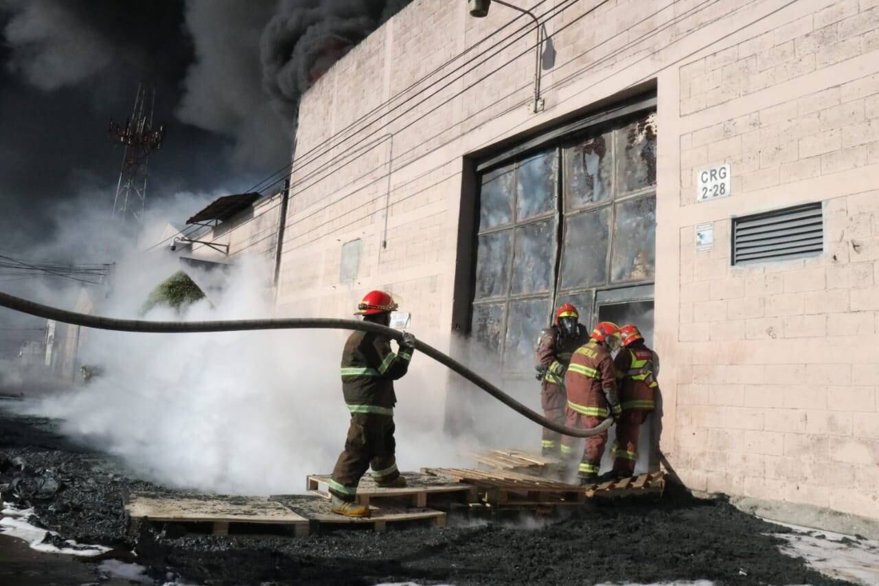 Cuatro bomberos resultaron heridos durante los trabajos para apagar el incendio de grandes proporciones registrado en un complejo de bodegas ubicado en la zona 2 de Mixco.