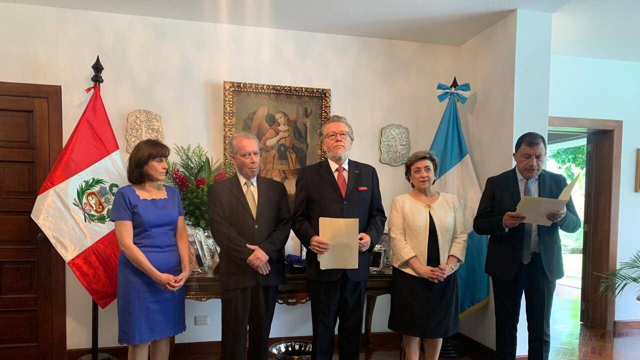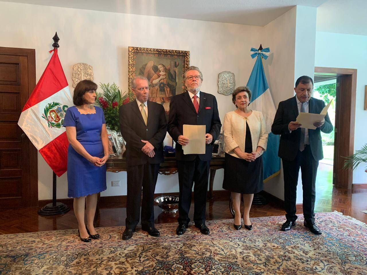 El embajador de Perú en Guatemala, Amador Velásquez García, entregó este martes un reconocimiento al presidente de la Cámara de Comercio de Guatemala, Jorge Briz.