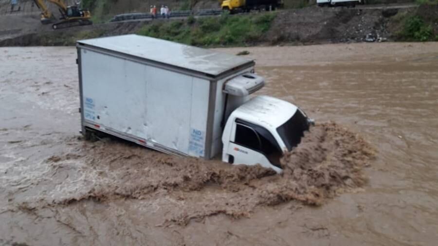 Un camión repartidor de color blanco, así como una vehículo tipo camionetilla color azul fueron los vehículos que la correntada del río arrastró.
