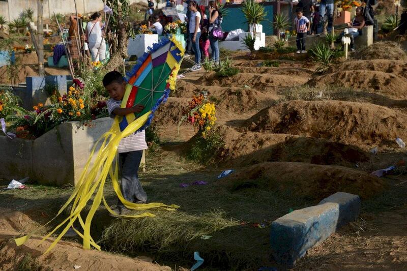 Simultáneamente, en Santiago Sacatepéquez, los pobladores se reúnen en el Cementerio General de la localidad y entre las tumbas paran a los gigantescos barriletes, los cuales deben pelear contra el viento para mantenerse de pie.