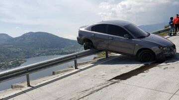 Tras el choque, parte del automóvil quedó sobre el borde de la estructura y el eje trasero completamente en el aire. Estuvo a punto de caer al precipicio.