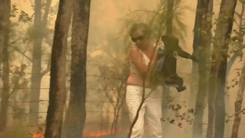 La mujer se abrió paso entre el bosque incendiado y consiguió alcanzar al koala cuando este logró trepar a un árbol. Se quitó la camiseta para envolverlo en ella y así protegerlo de las llamas y el humo, y de inmediato lo sacó del lugar.