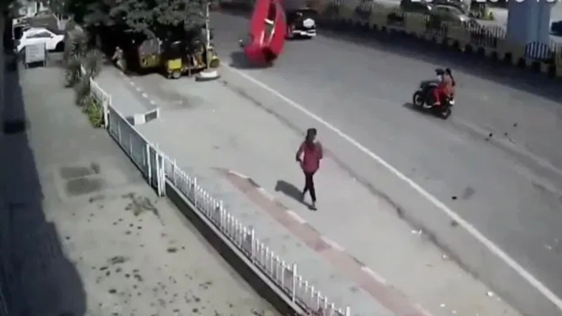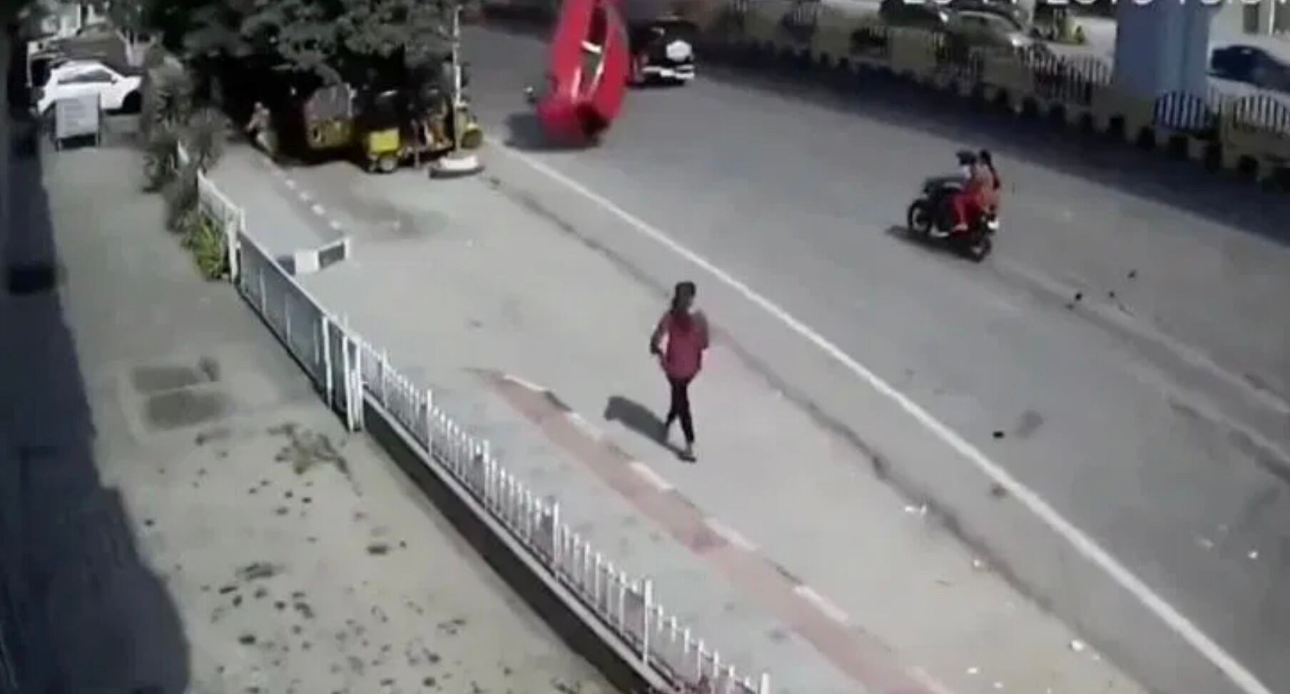 Insólito accidente en la India. Un vehículo que viajaba a excesiva velocidad en un viaducto de la ciudad de Hyderabad, en el sur del país, perdió el control en una curva y salió despedido por los aires, cayendo sobre un grupo de personas y matando a una de ellas.